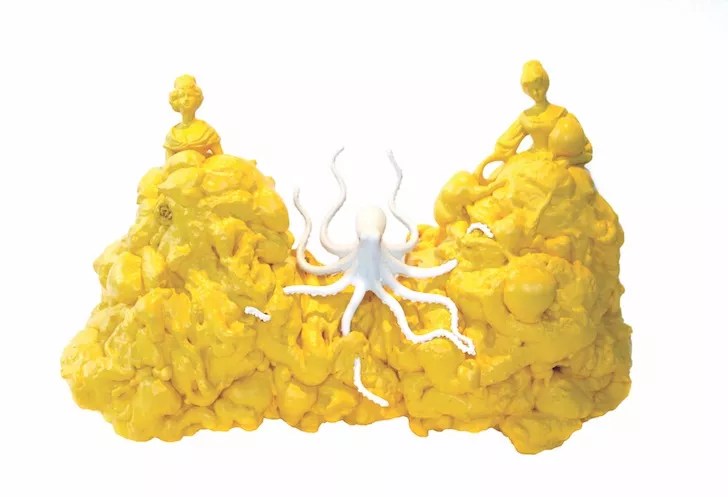 The macabre Flayed Superficial Soft Tissue shows the meticulously realistic painting skills of the self-taught Alejandro Augustine Padilla, but two years ago he began making fantastic three-dimensional works using found objects, paint and spray foam insulation. The yellow-painted foam provides a cloud-like base for the otherworldly The New Monsters, the New Myths, with a pair of porcelain female figures topping peaks over an albino octopus. The robed figure casting a spell with a splash of gold foam in Bye Bye Blackbird has a Darth Vaderish vibe.