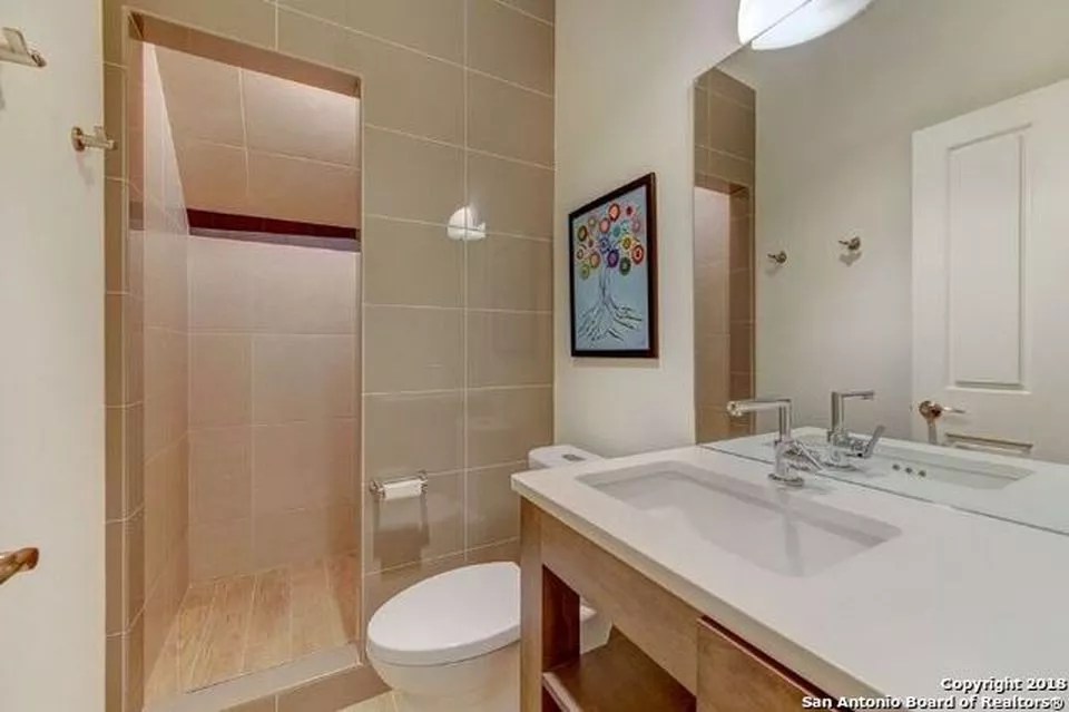The home’s bathrooms are all modern. The master bathroom has a walk-in shower.