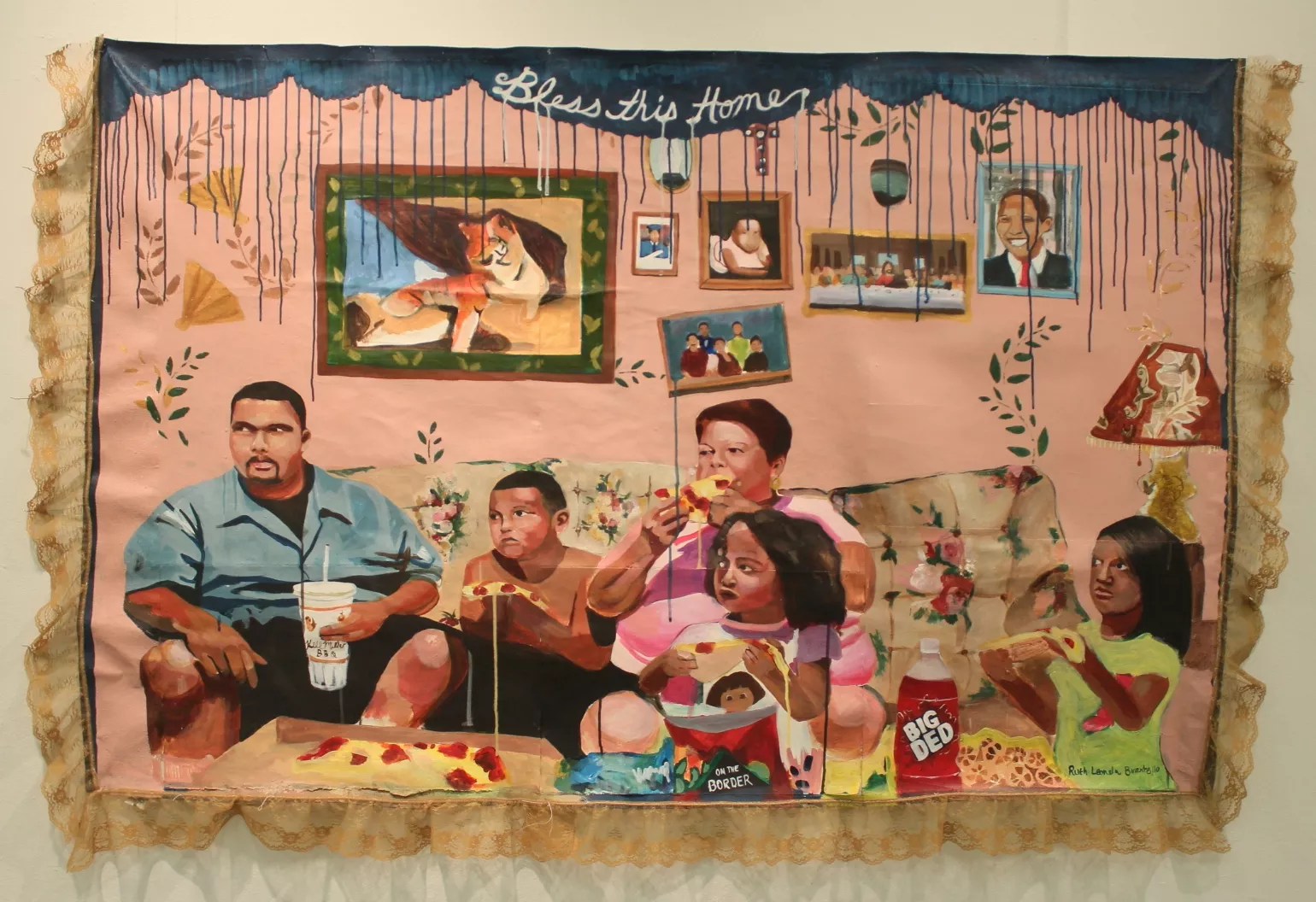 Based on family snapshots, Buentello’s large-scale paintings Gamer Niñas and The Last Supper are lovingly framed in ruffled fabric and hung atop wallpaper.