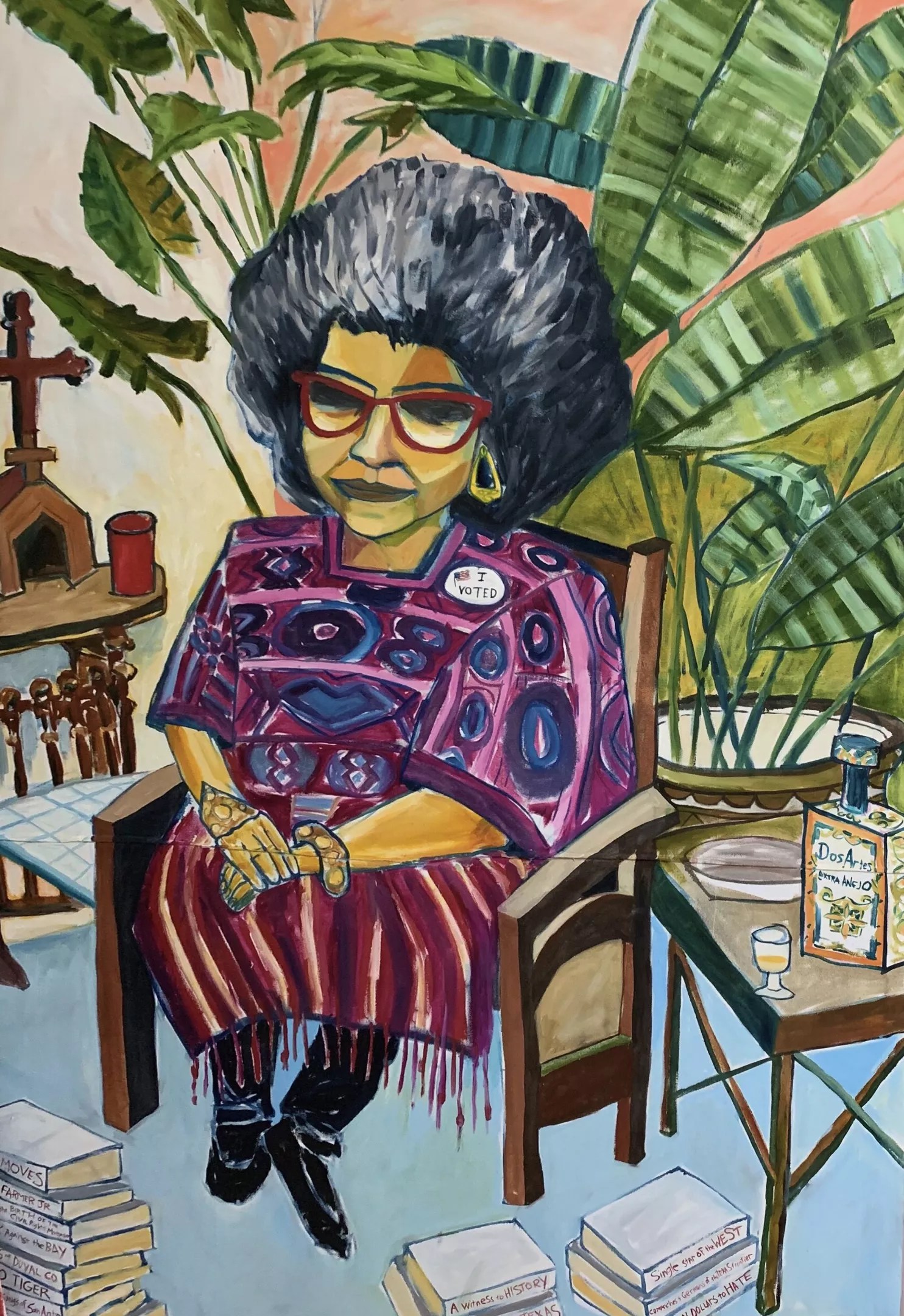 Once better known for graphic screen prints, Ortiz has been taking portraiture seriously lately and even documents his live sittings. In addition to countless portraits of his wife Olivia, Ortiz has put his signature spin on San Antonio personalities including artists Jesse Amado and Alejandro Diaz, and politicos Julián and Joaquin Castro. A shining example of this new chapter is a portrait of scholar, educator and author Ellen Riojas Clark.