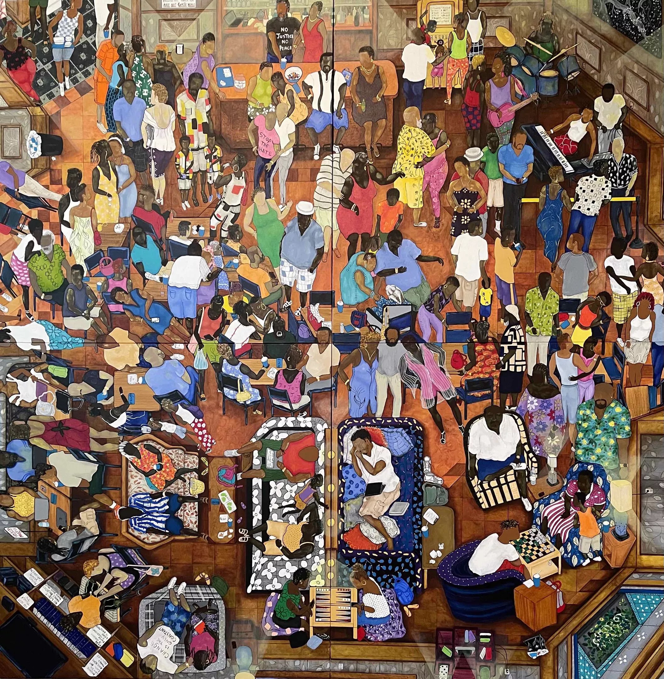 A self-described painter and storyteller, Johnson paints people and places in an exuberant style. Among her featured works is The Octagon Room — a densely packed painting that offers a fisheye view of a Black community gathered in celebration. It seems to divulge something new with each glance.