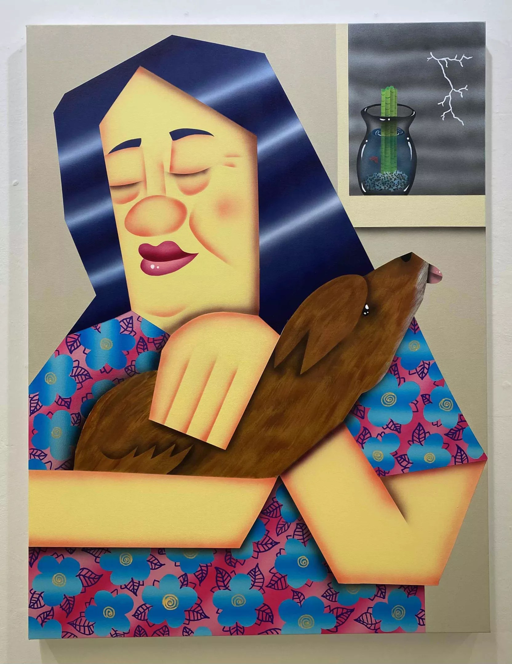 Delightfully quirky and cartoony, Huynh’s paintings show his adorable mother slicing fish, preparing pho and clutching a cowering dog in the midst of a storm. As McGilvray explained, Huynh left his dog in his mother’s care when he went to college, and the pair formed a bond.