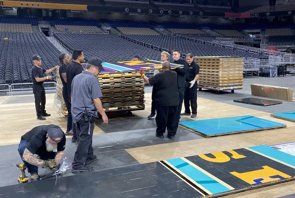 The NCAA Final Four courts typically take four hours to install using a team of Connor supervisors and as many as a dozen local workers, company officials said.