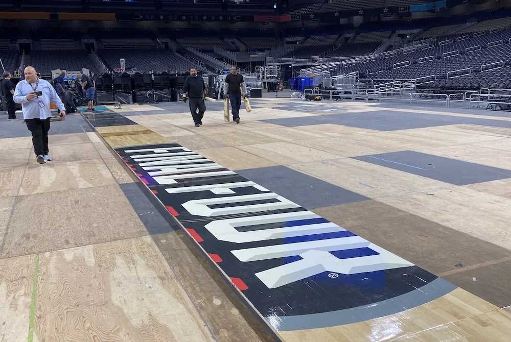 Connor Sports created the panels for the 2025 court beginning last fall at its mill in rural Michigan. In January, the company shipped the pieces to QHF Sports in San Marcos, which painted and coated them. Each year, Connor produces a completely new court for both the men’s and women’s Final Four tournaments.