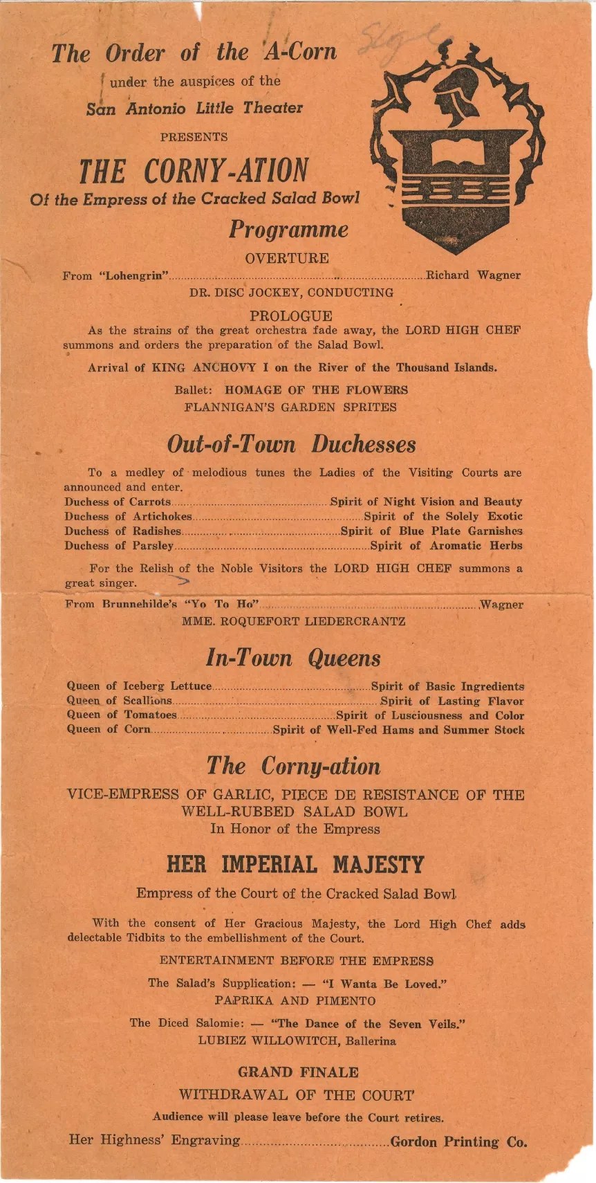 Kay Crews as Her Asthmatic Majesty, 1952Duchess, Cornyation 1964Local legend Gene Elder as King Anchovy in the ’80sGretchen Shoopman as Empress of the Song of No Way, 1987 (photo by Ruben Njaa)Cornyation 1982 (photo by Al Rendon)Queens of the Glorified BarnyardCornyation 1953Court of the Glorified BarnyardScarecrow, Court of the Glorified BarnyardAnn Kinser as the Queen of Scintillating Saturn, 1993 (photo by Michael Mehl)Queen of MascaraAnne Thompson as the Empress of the Court of Cosmetic Subterfuge, 1953Terry Behalf as the Duchess of Herman’s Happiness, 1996 (photo by Al Rendon)Queens of Lipstick and MudmaskElaine Honigblum as the Vice-Empress of Vice, 1959Mary Byall as the Empress of the More-the-Marrier, 1963Mary Byall as the Empress of the More-the-Marrier, 1963Miss Red Light and Company, 1960Cari Hill as Vice-Empress of the Court of Outrageous Pretentiousness, 1991 (photo by Al Rendon)Cornyation 1953Wheel-O-PoliticsCornyation 1965Cornyation 1953“Fiesta Aftermath” issue of The Calendar, 19841951 Cornyation Program