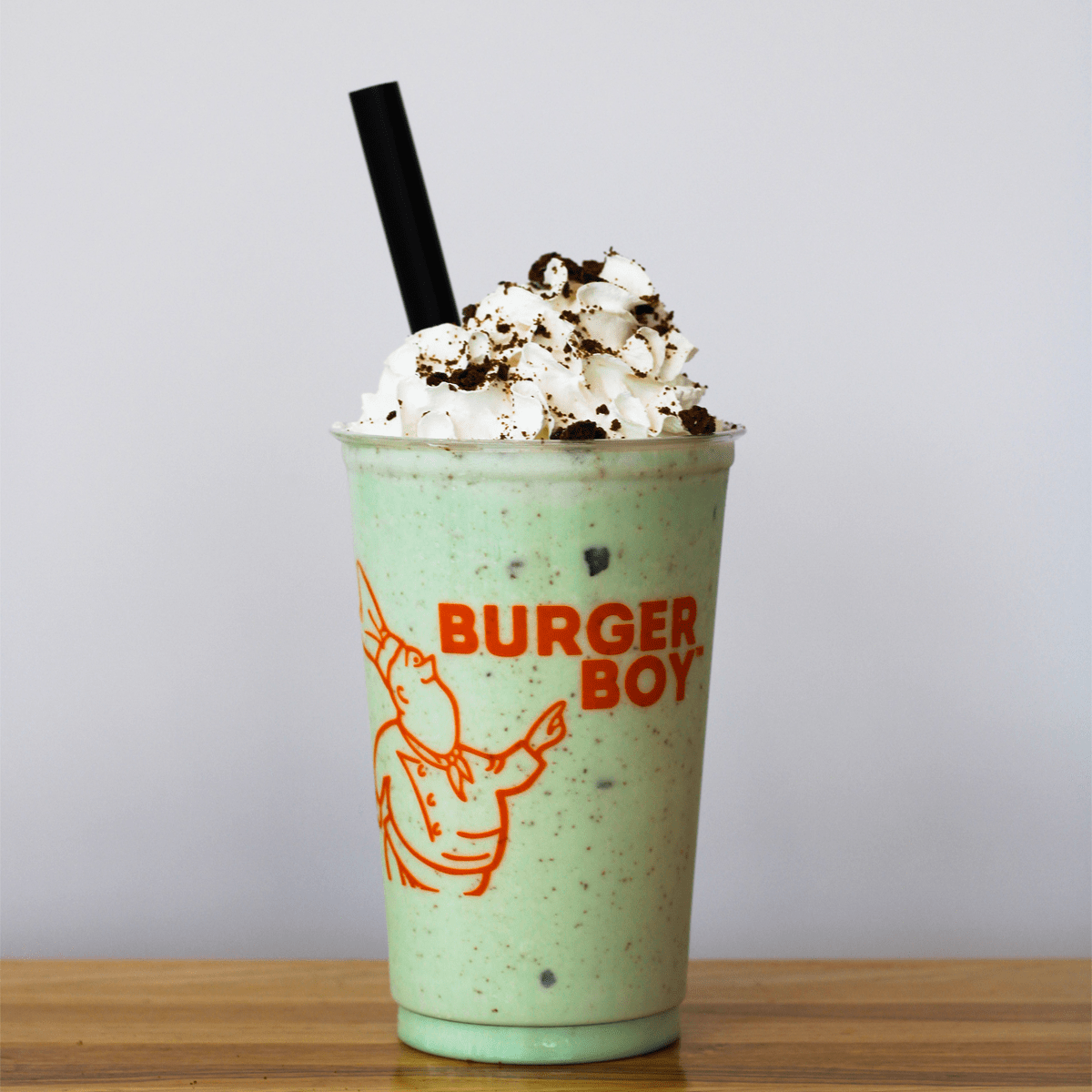 The concoction features Girl Scout Thin Mints mixed into Burger Boy’s specialty shake blend, topped with more cookie bits and whipped cream.