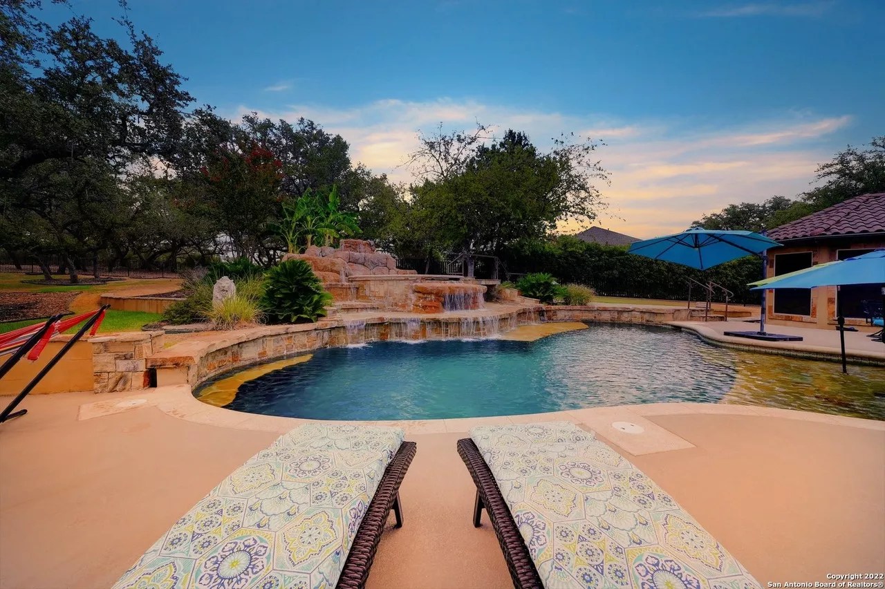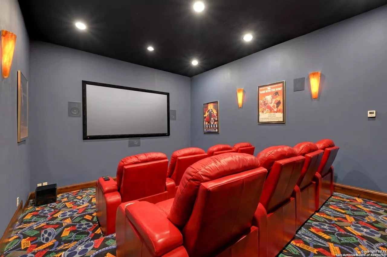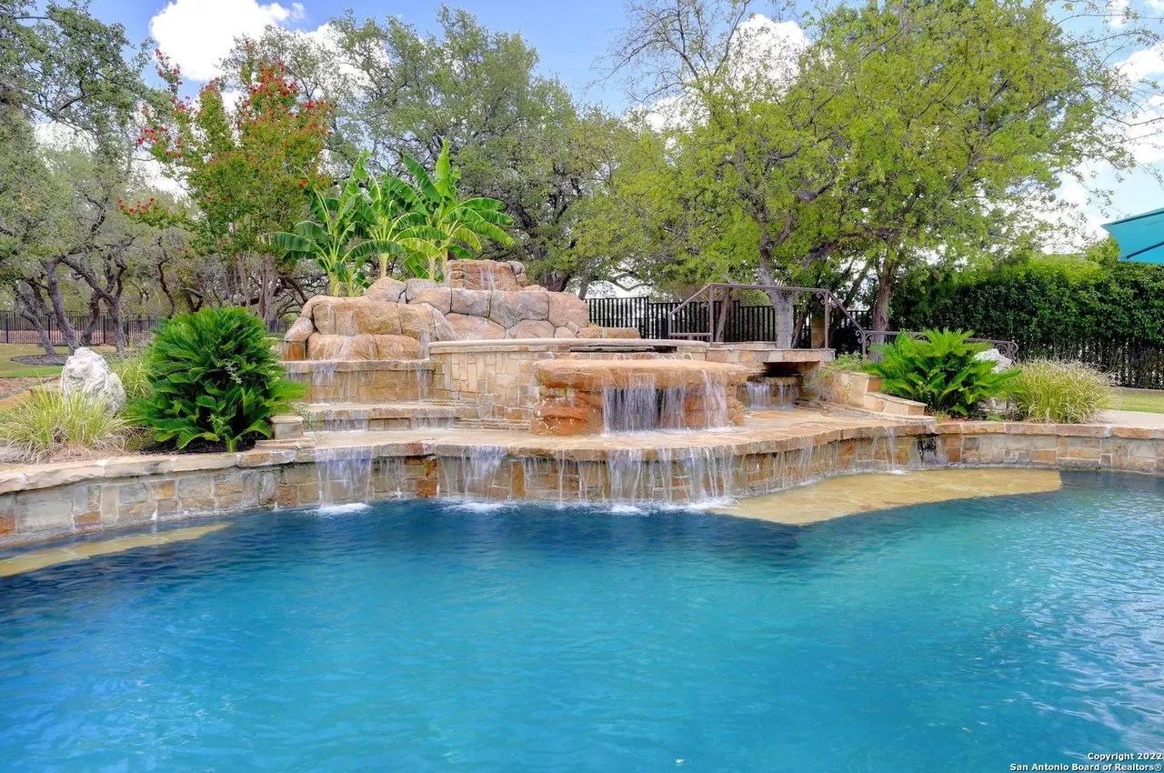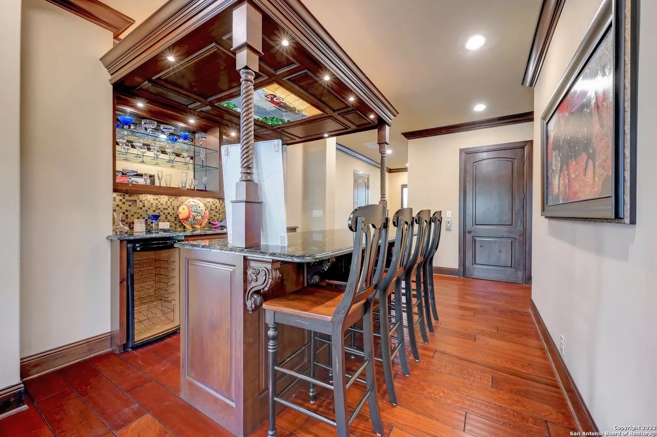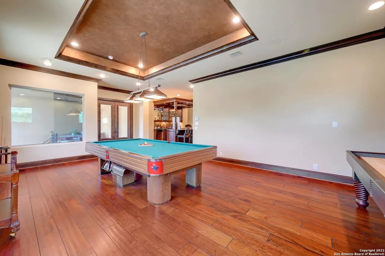 A custom bar with its own billiards room, a sizable swimming pool and a home theater round out the other high-end offerings in the six-bedroom, four-and-a-half-bath residence.