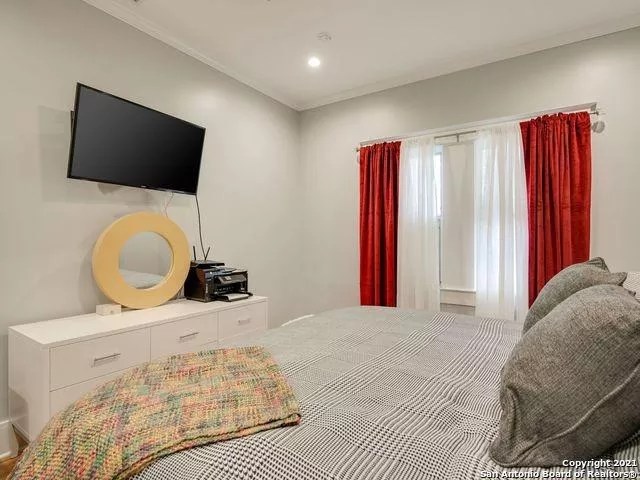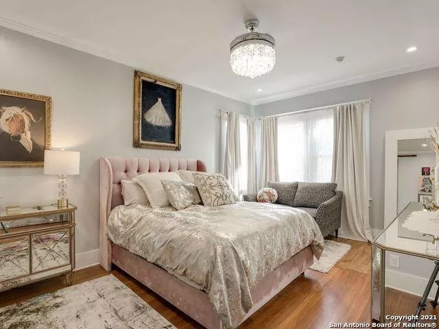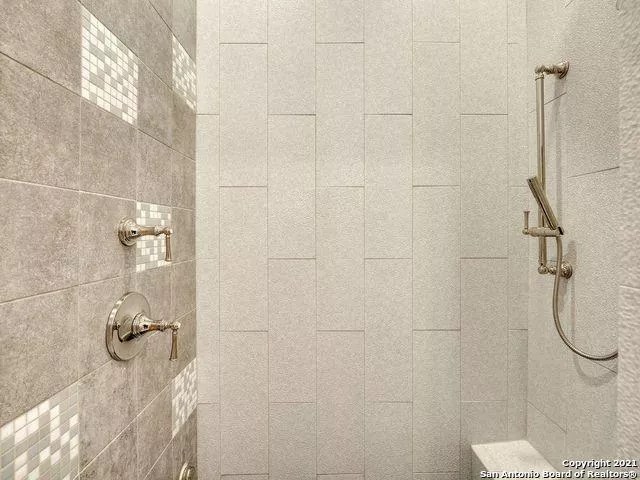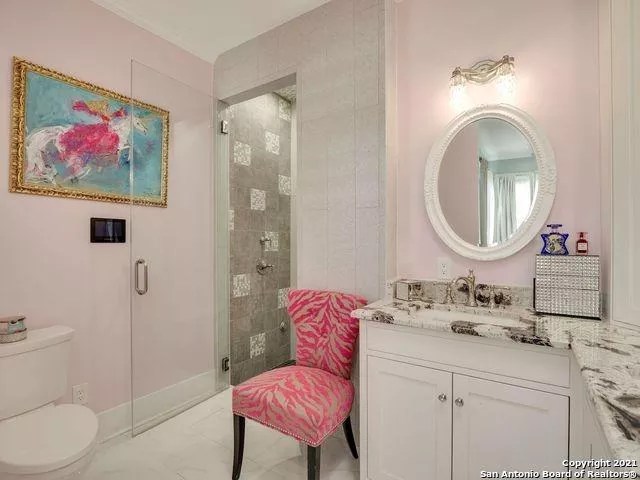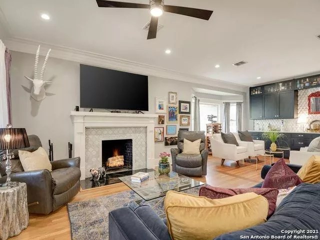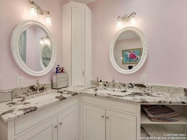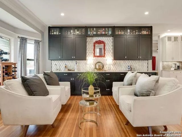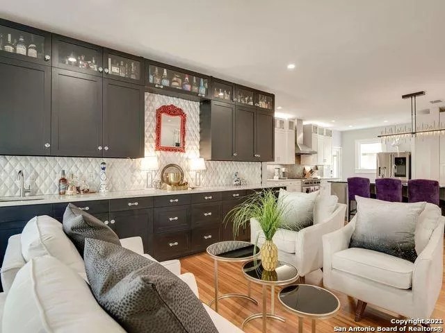 Dialing up the swankiness, a supersized wet bar serves as a focal point in the living area. Marble counters and a backsplash of diamond-shaped tile give it a kick of style, while the glass-fronted cabinets seem tailor-made for a home mixologist to show off their collection of fancy booze.