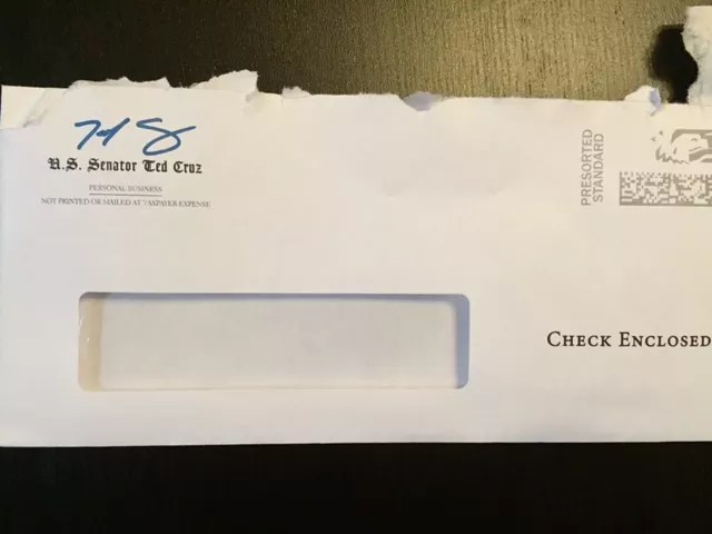 The mailer, which lists his Senate office address and says “Check Enclosed” on the outside of the envelope, contains a fake check made out to Cruz for $45 (the Texas Senator wants to be the 45th president). The mailer asks the recipient to mail the check back as part of a “matching program.”