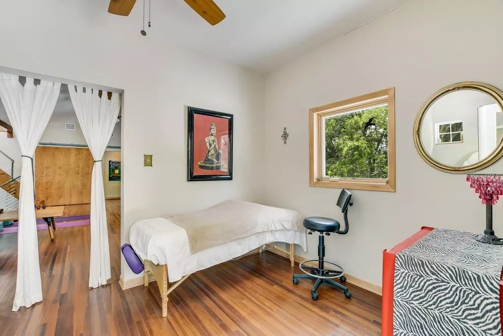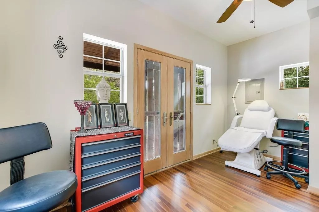 One room contains a medical procedural chair for a Botox side business to keep things tight. Meanwhile, another room for yoga and meditation promises to keep things loose.