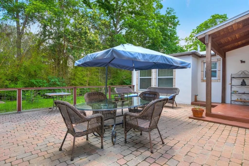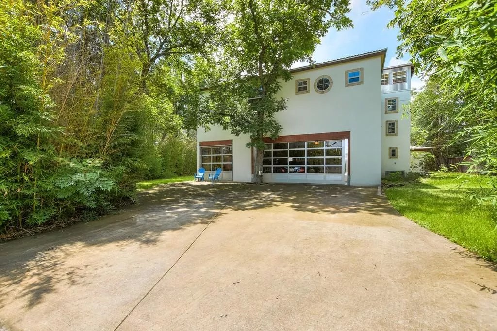 A variety of attractive woodwork styles adorn many of the ceilings, from exposed beams to patterns made with narrow boards. A third story cupola looks out over the nearly half-acre wooded lot. An outdoor entertainment area expands indoors with overhead doors that open up the sides of the garage for more space and a wet bar.