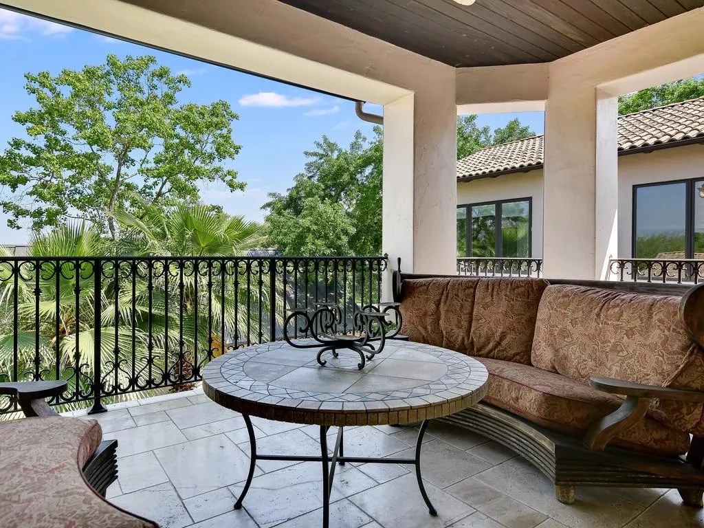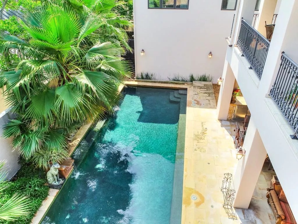 For one thing, the kitchen has a massive cooktop with a copper vent hood along with an equally expansive granite island. Then there’s the backyard pool surrounded with palm trees that’s overlooked by both a covered patio and a balcony off the master suite.