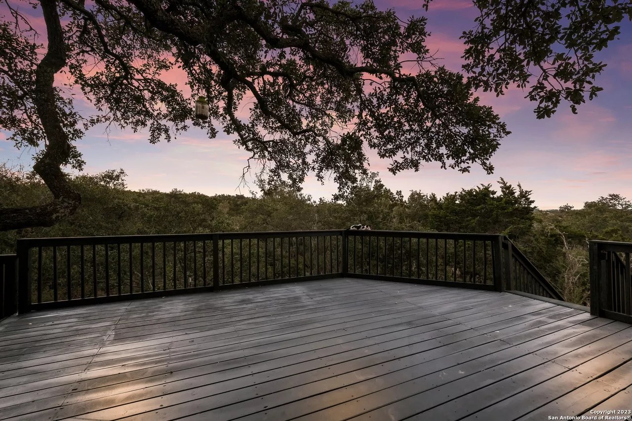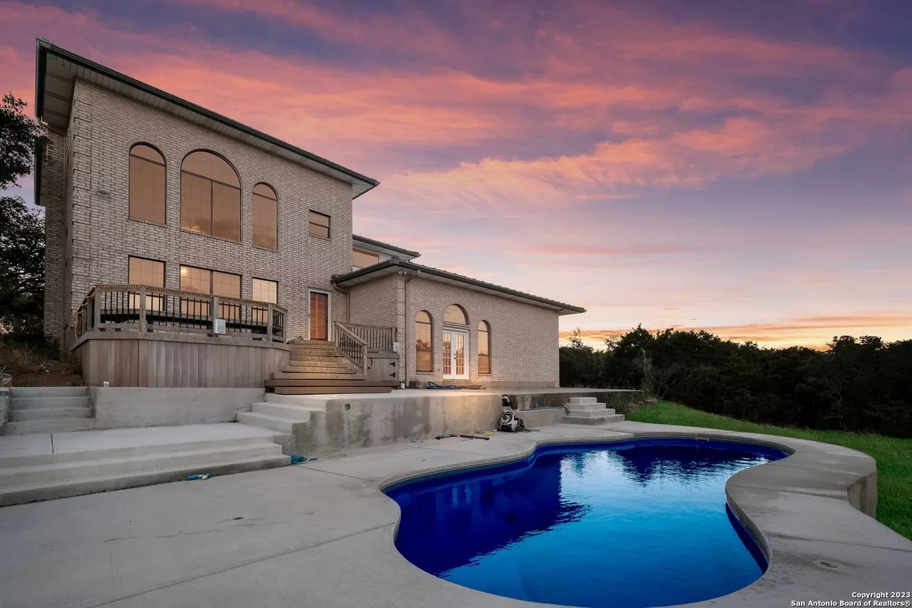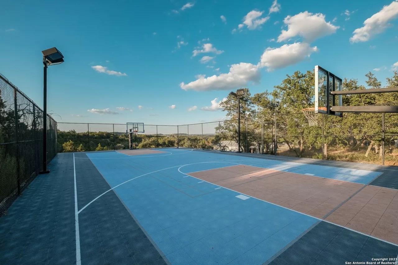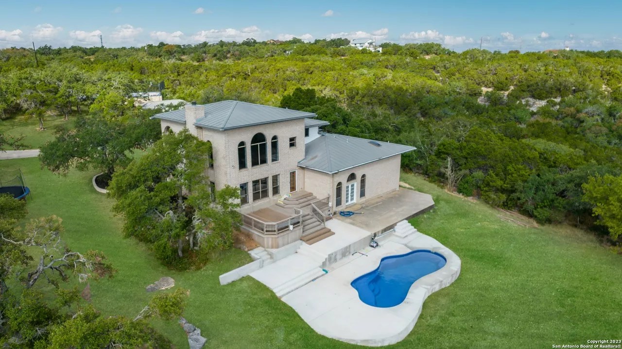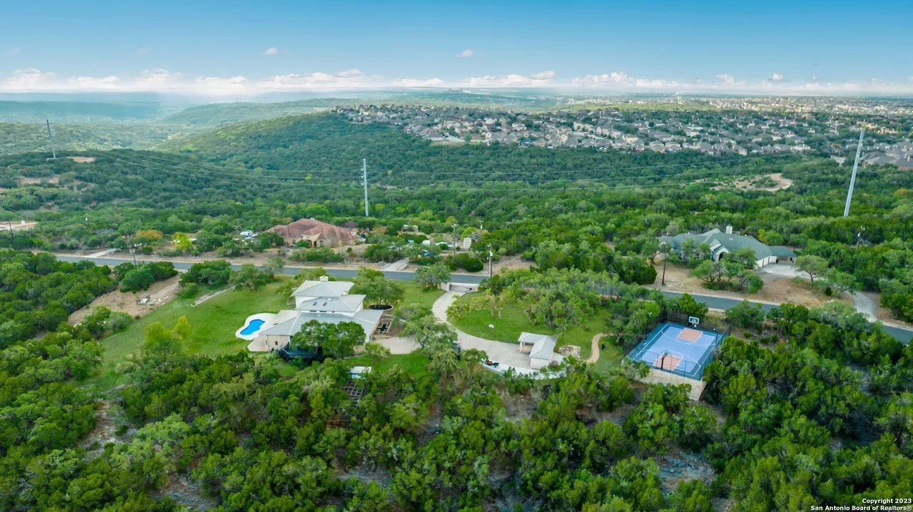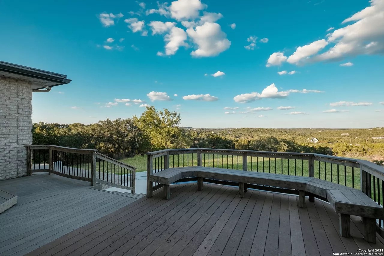 A 4,278-square-foot home currently listed for sale in Stone Oak sits on five acres of land with unobstructed views of Hill Country from its large deck. For those who like to sport in style, it also features a saltwater pool and a basketball court.