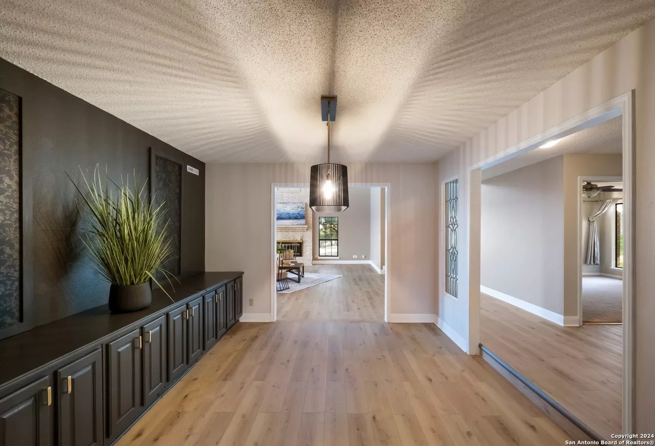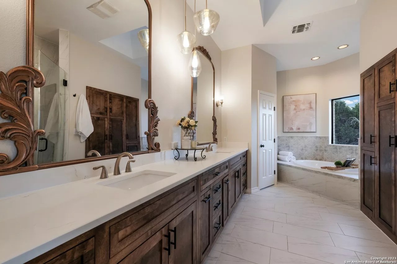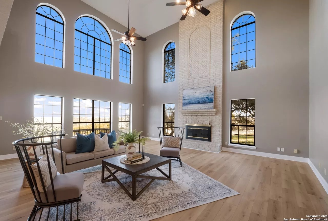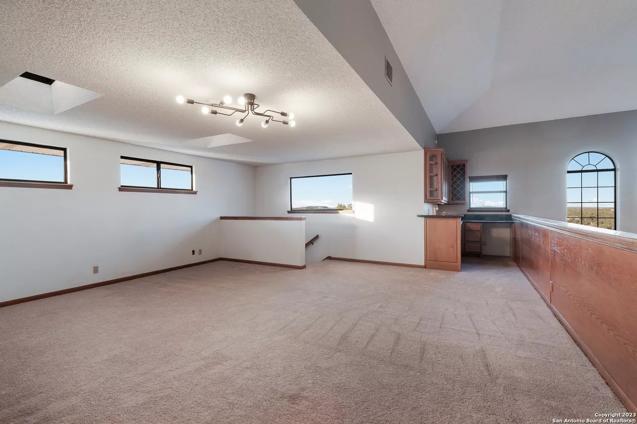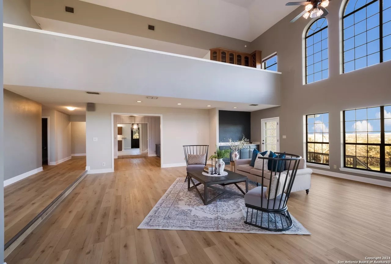 A 4,278-square-foot home currently listed for sale in Stone Oak sits on five acres of land with unobstructed views of Hill Country from its large deck. For those who like to sport in style, it also features a saltwater pool and a basketball court.