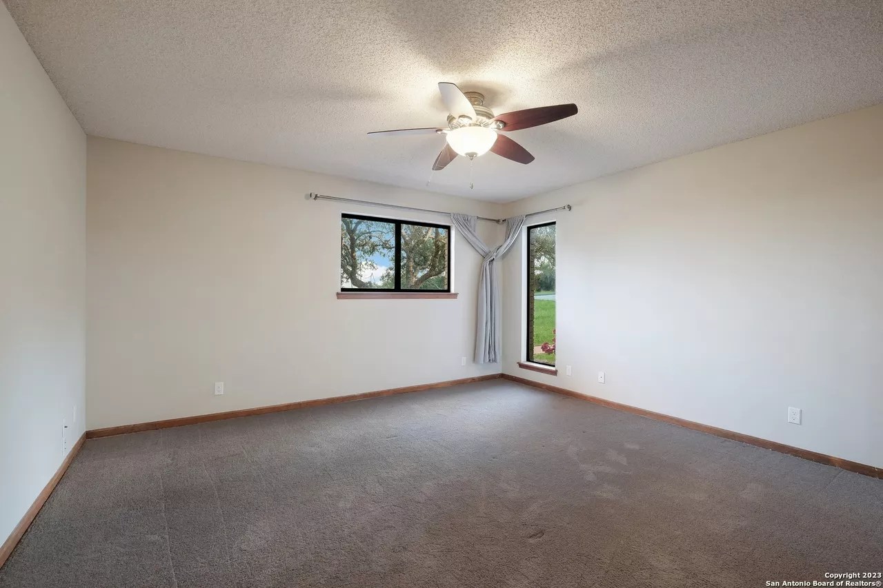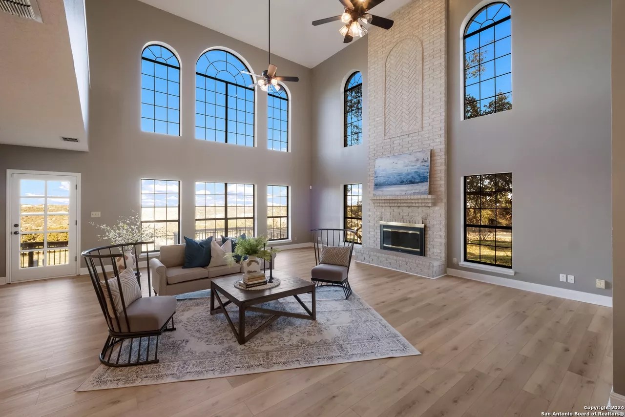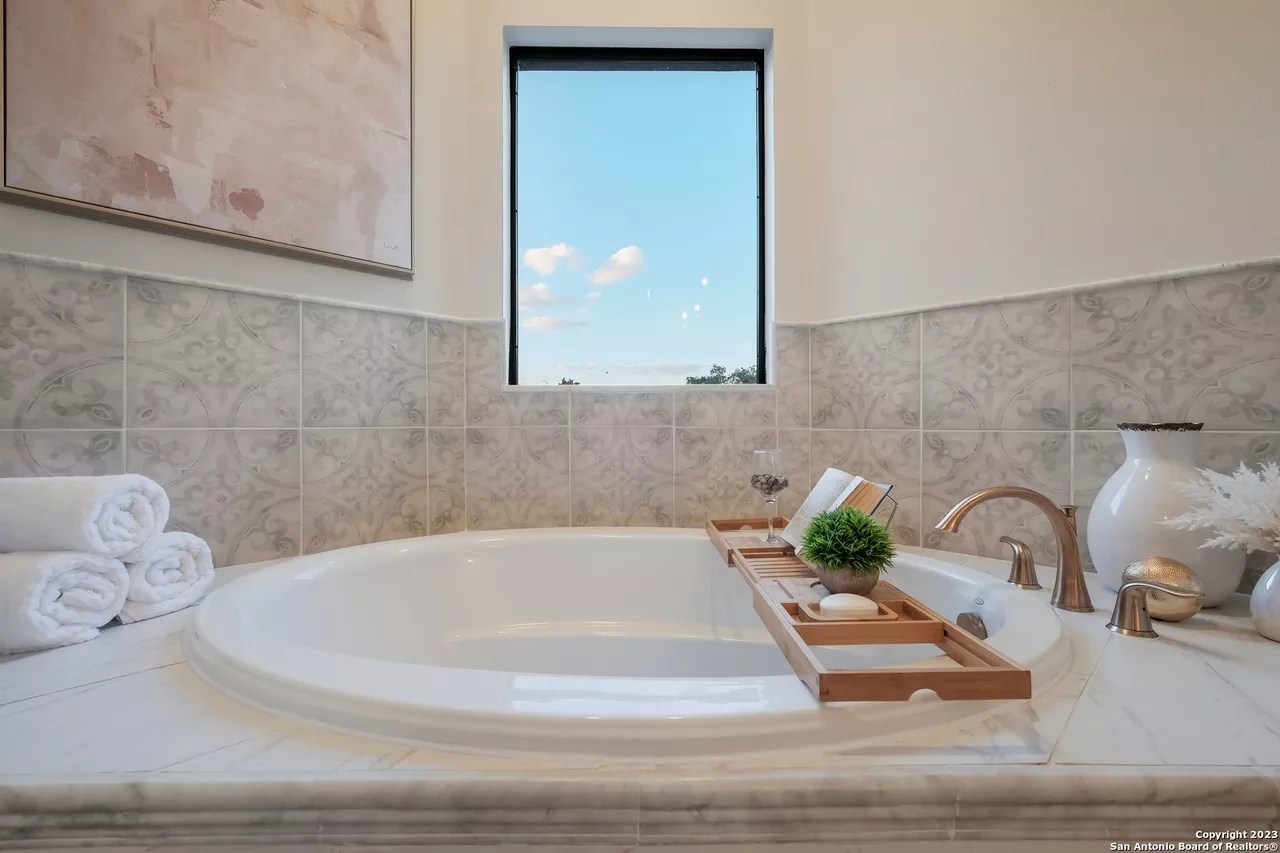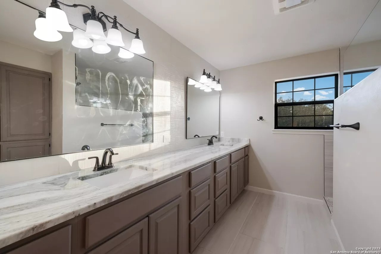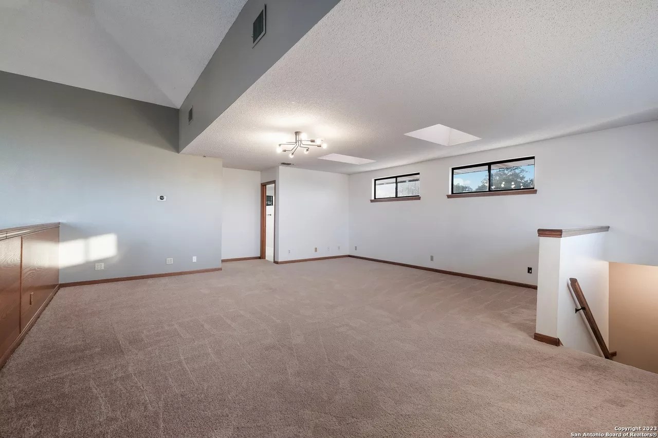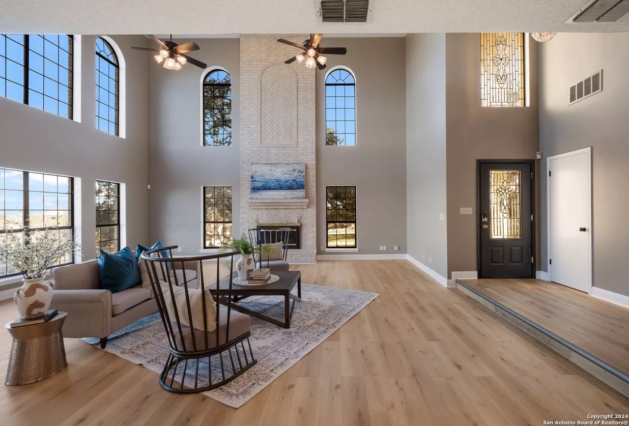 A 4,278-square-foot home currently listed for sale in Stone Oak sits on five acres of land with unobstructed views of Hill Country from its large deck. For those who like to sport in style, it also features a saltwater pool and a basketball court.