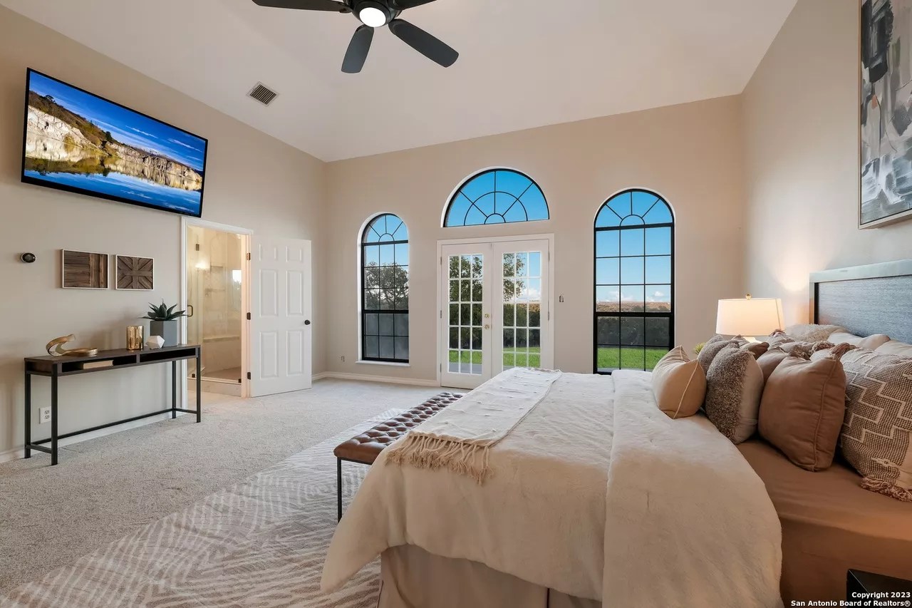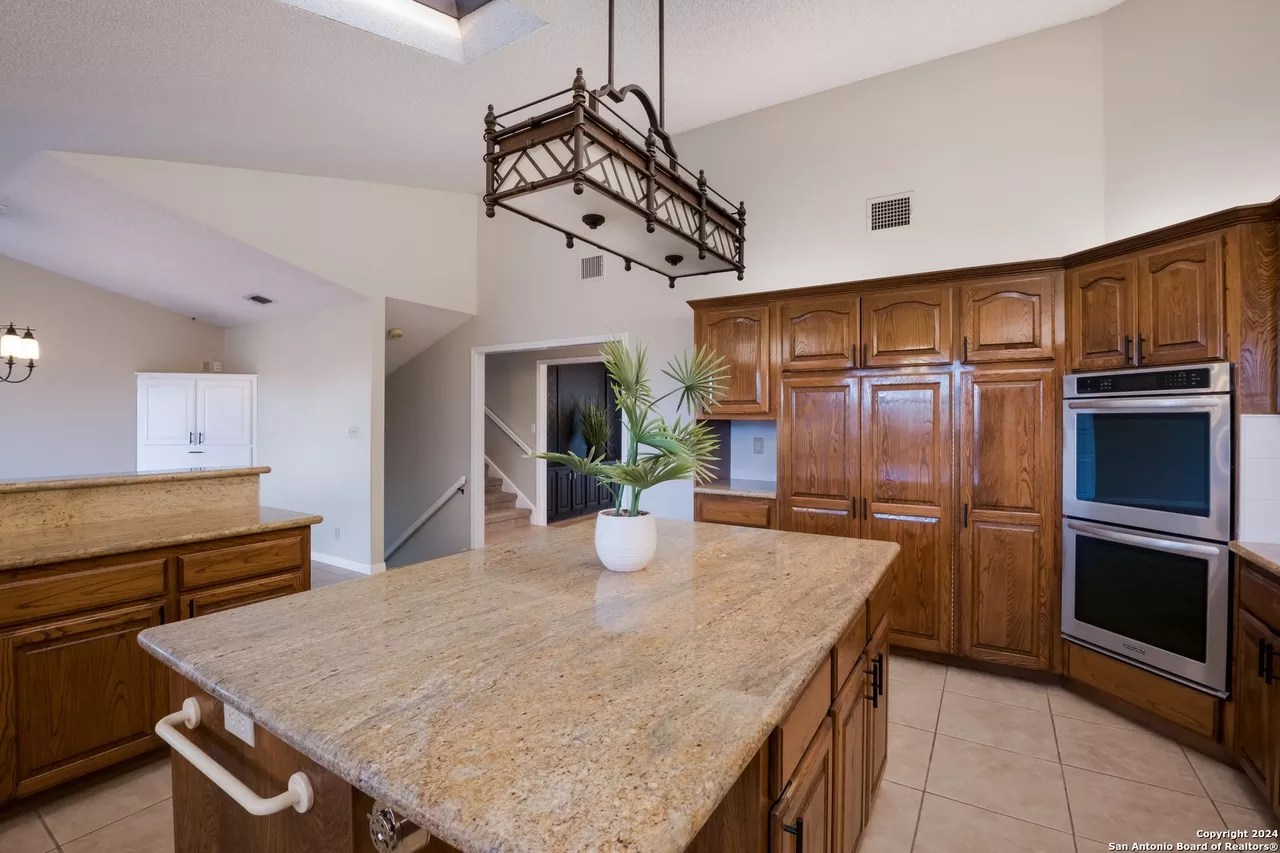 The master bedroom has French doors with direct access to the pool, and the large master bath includes a glass shower as well as a spa-like soaking tub. The expansive kitchen is equipped with an island, double ovens and granite countertops.