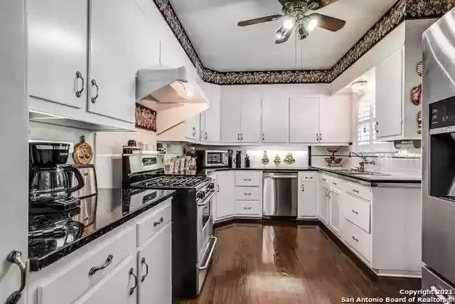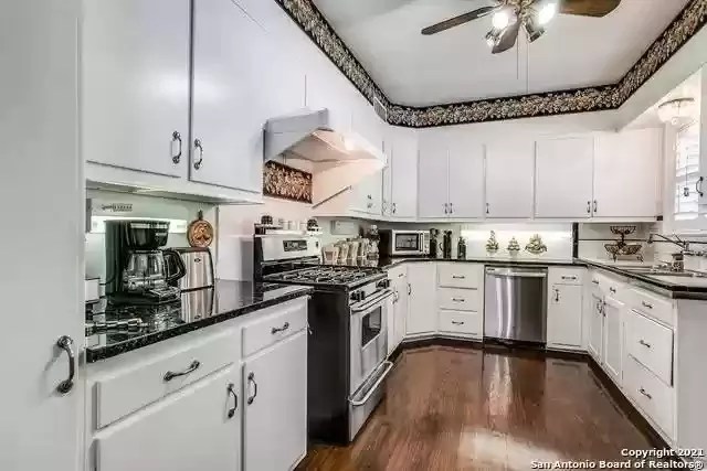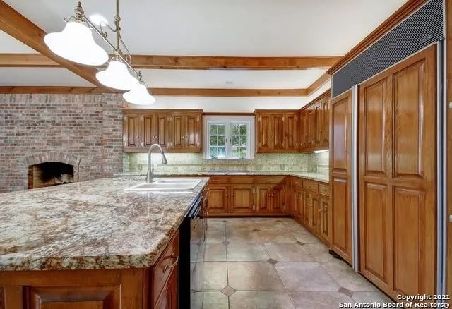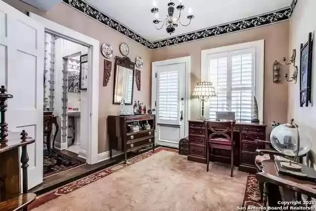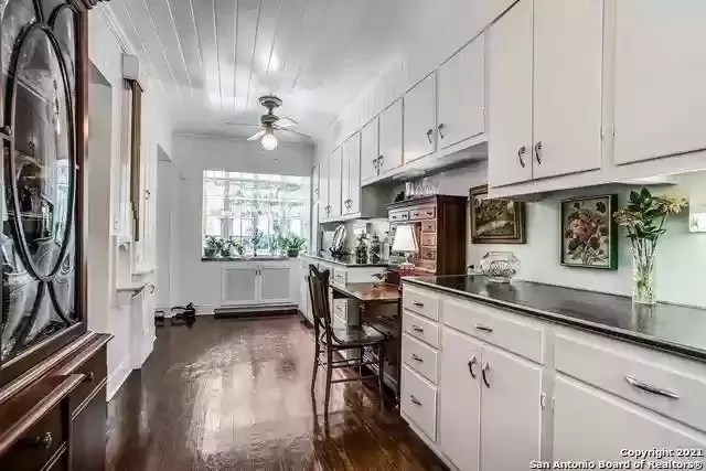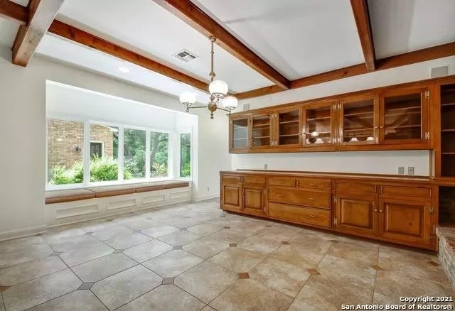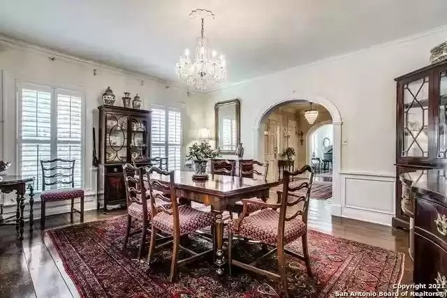 Each of the home’s three fireplaces is customized to the room it warms. Those include a utilitarian fireplace in the kitchen and informal dining area, a formal one in the dining room and a more modest hearth and mantel in another living area.