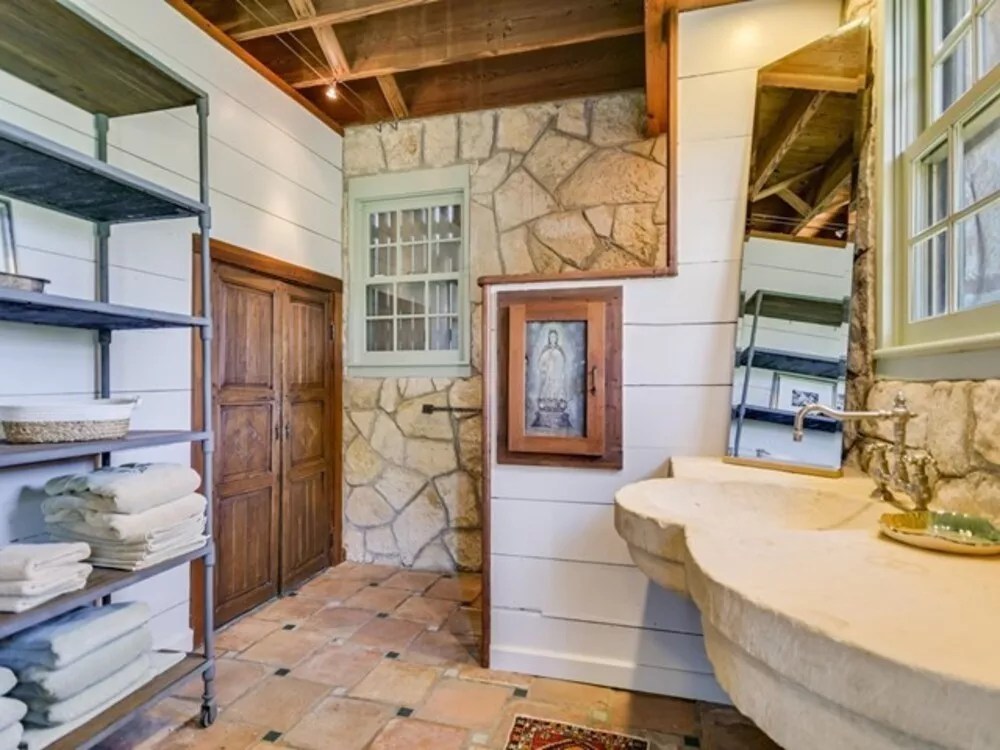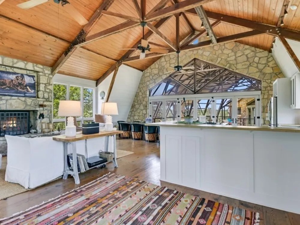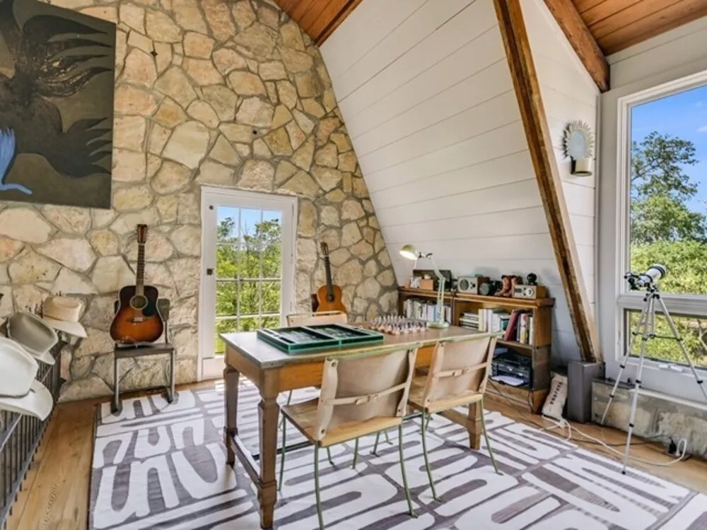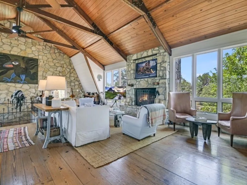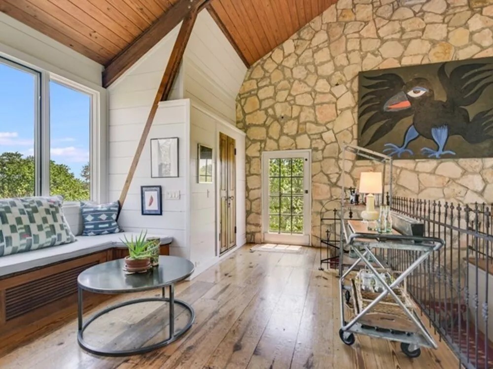 One of the most unusual of those is the two-story glass atrium which connects the 4,100-square-foot main house with a separate guest cottage. A catwalk spans the area, which the sales listing describes as an “enclosed conservatory, where a fireplace beckons on cooler days, creating a sanctuary in the heart of nature.”