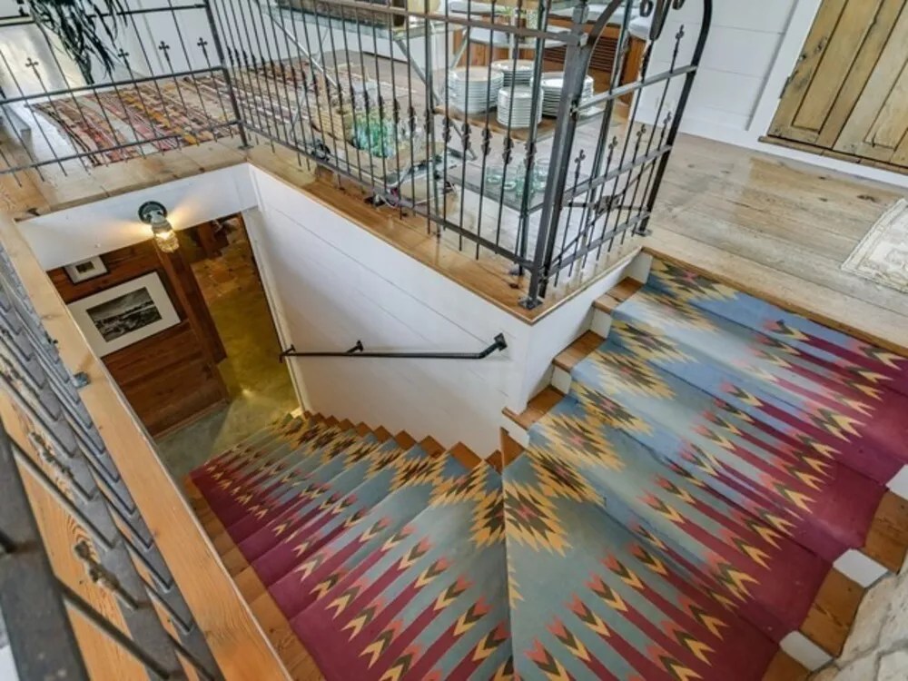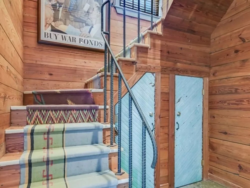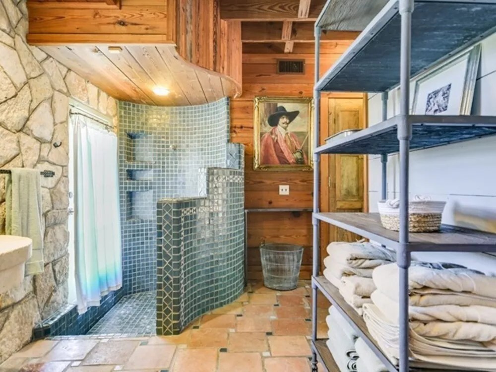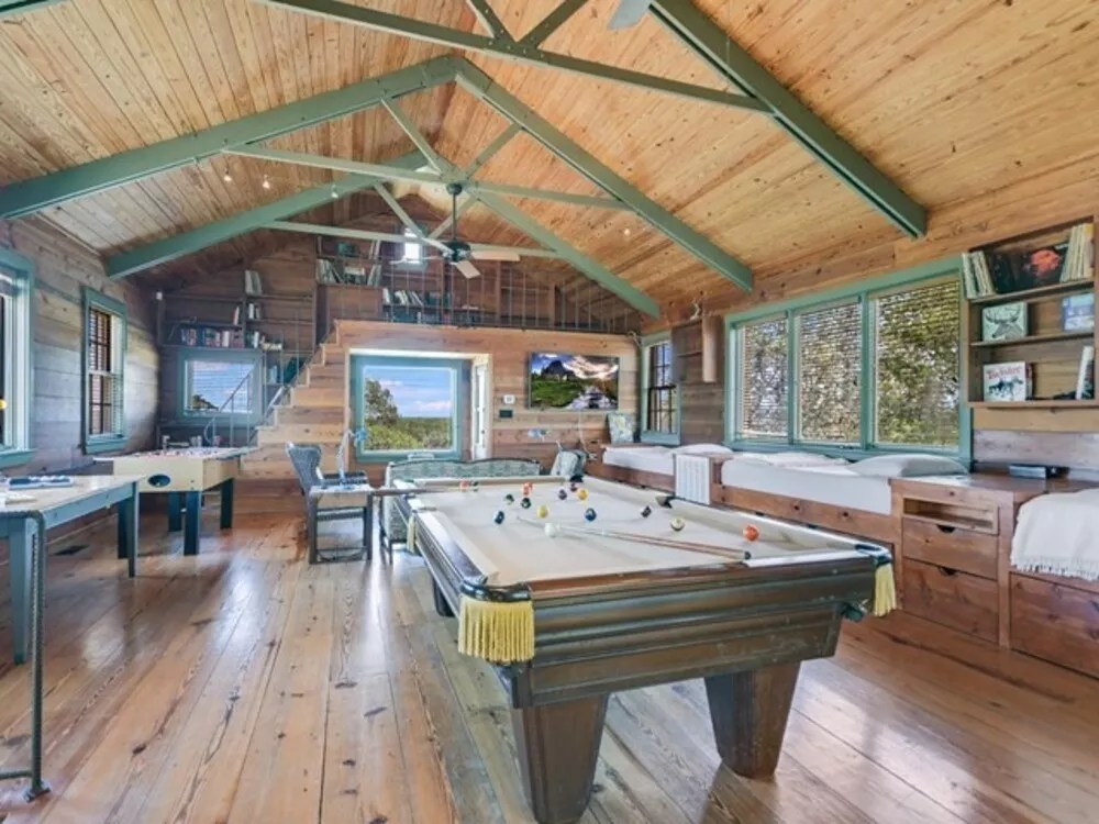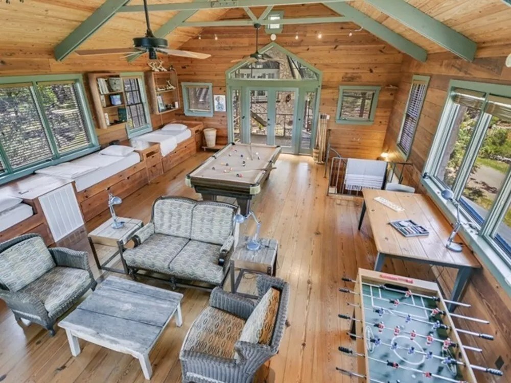One of the most unusual of those is the two-story glass atrium which connects the 4,100-square-foot main house with a separate guest cottage. A catwalk spans the area, which the sales listing describes as an “enclosed conservatory, where a fireplace beckons on cooler days, creating a sanctuary in the heart of nature.”