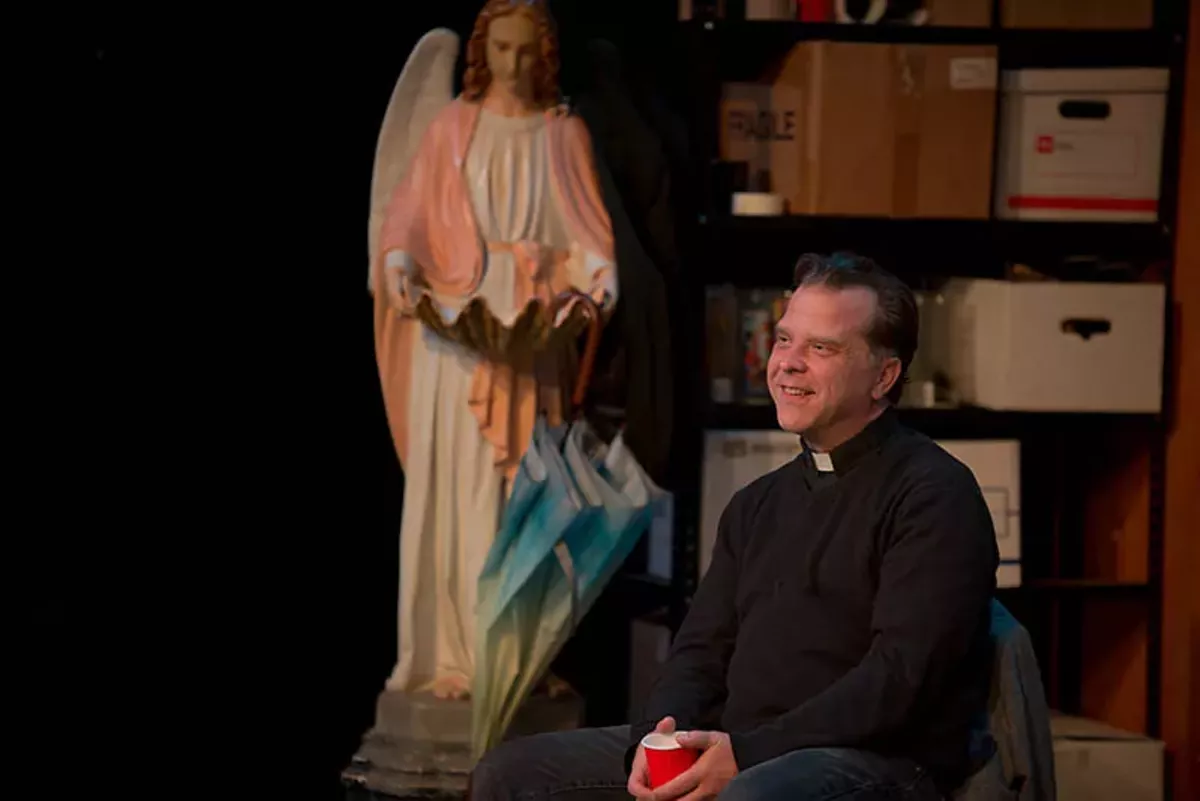AtticRep first produced The Irish Curse in May, 2011, and this revival enlists two new actors — Alejandro Cardona as Rick Baldwin, a 22-year-old Irish-American who masks his physical deficiency by stuffing a sock in his pants and affecting lechery, and Sam Mandelbaum as Kieran Riley, an actual Irish immigrant who wanders in out of the rain with a woeful tale that outdoes them all. Convening the proceedings is Father Kevin Shaunessy, played with panache by Rick Frederick (also responsible for the set design), who, last seen here as Austin in True West, continues to demonstrate remarkable versatility. Challenged to talk about himself, jolly Father Kevin, who gets flustered when the others become too bawdy or combative, reveals that he, too, has the Irish curse; it is why he became a priest. "Aren't you ever angry at God?" asks Kiernan. No one blames Saint Patrick, who chased the snakes — those phallic devils — from Ireland.